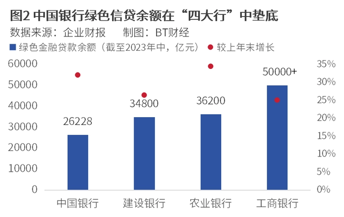 以2023年中报数据横向对比,6月末,中国银行在中国内地绿色信贷余额折合人民币达26228亿元,同比增长51.22%。从增速来看,中国银行绿色信贷余额增长迅猛;但从绝对量来看,同期工商银行超5万亿元的绿色信贷水平冠绝全行业,建行、农行的这一指标也都到了约3.5万亿元及以上,中国银行2.6万亿元的体量仍较小。