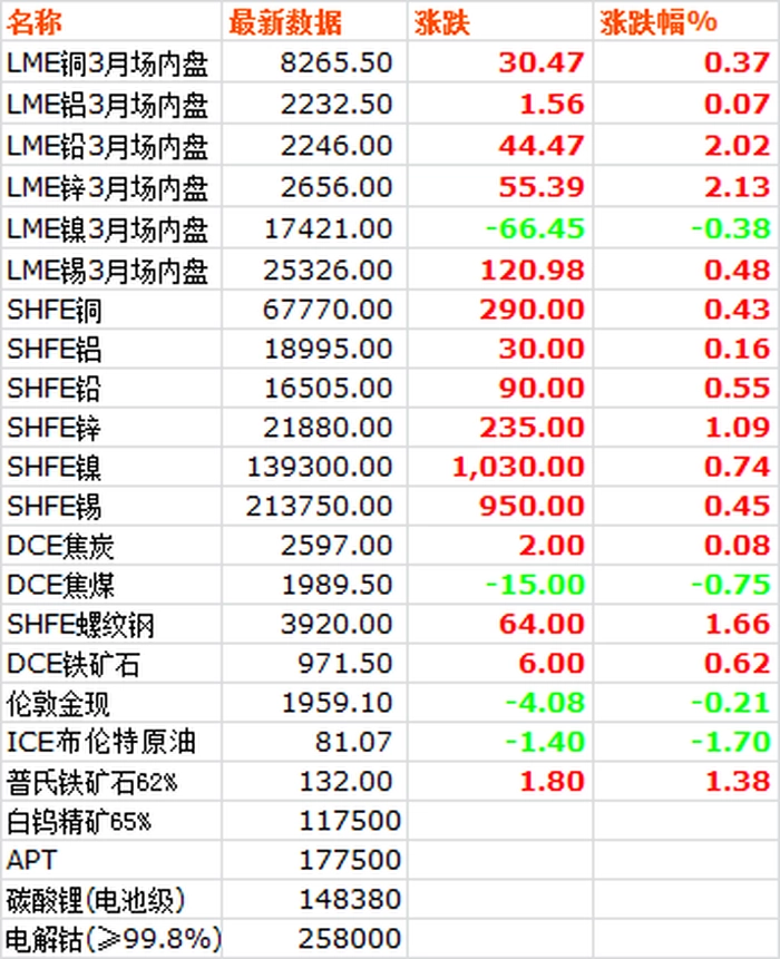 11月15日,LME六种基本金属价格涨多跌少,锌铅涨幅居前,仅镍小幅下跌。三月期铜价收于8265.5美元/吨,上涨0.37%。三月期铝价收于2232.5美元/吨,上涨0.07%。三月期铅价收于2246美元/吨,上涨2.02%。三月期锌价收于2656美元/吨,上涨2.13%。三月期锡价收于25326美元/吨,上涨0.48%。三月期镍价收于17421美元/吨,下跌0.38%。