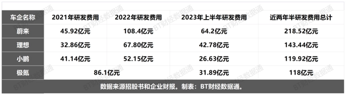 蔚来在2021年和2022年的研发费用为45.92亿元、108.4亿元,2023年上半年研发费用为64.2亿元,近两年半的研发费用为218.52亿元;同期小鹏的研发费用为41.14亿元、52.15亿和26.63亿元,合计为119.92亿元;理想同期研发费用为 32.86亿元、67.80亿和42.78亿元,合计为143.44亿元。极氪的研发费用低于蔚来和理想,但和小鹏持平,结合到蔚小理三家为上市企业,融资渠道优于未上市的极氪,极氪的研发投入值得称赞,研发员工数量也由2582人增加到5677人。