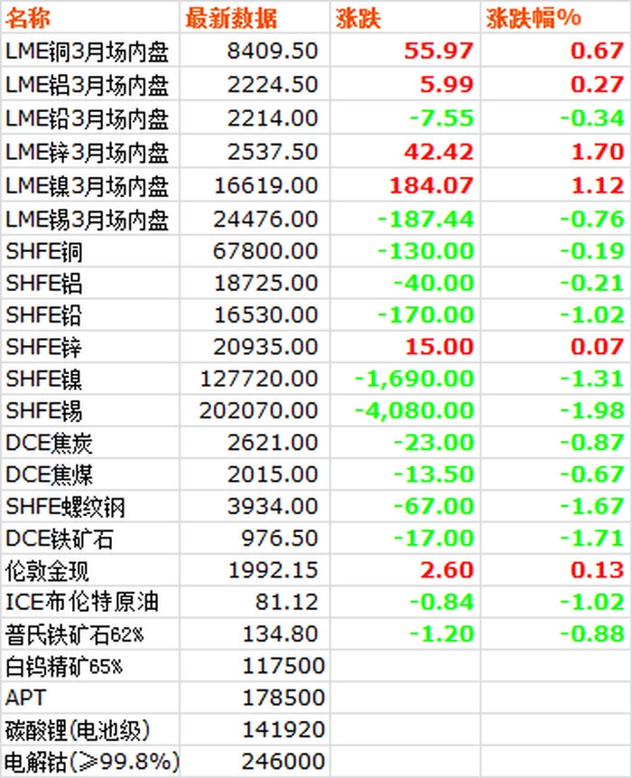 11月23日,LME六种基本金属价格涨多跌少,锌镍领涨,锡铅小幅下跌。三月期铜价冲高回落,收于8409.5美元/吨,上涨0.67%。三月期铝价探底回升,收于2224.5美元/吨,上涨0.27%。三月期铅价收于2214美元/吨,下跌0.34%。三月期锌价日内震荡上行,收于2537.5美元/吨,上涨1.70%。三月期锡价收于24476美元/吨,下跌0.76%。三月期镍价收于16619美元/吨,上涨1.12%。