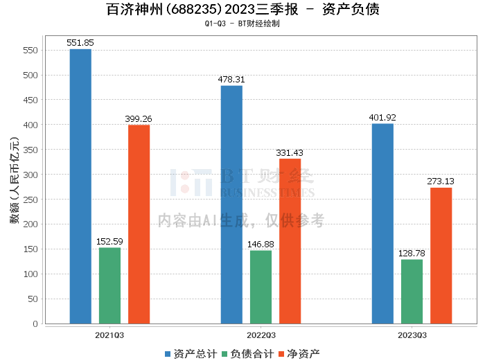 在资产负债方面,截至2023年三季度末,百济神州的总资产为401.92亿元,相较上年度末的442.24亿元有所下降。负债合计为128.78亿元,较上年度末的138.93亿元也有所减少。净资产则为273.13亿元,相比上年度末的303.31亿元减少。资产负债率略有上升,从上年度末的31.42%增至32.04%。