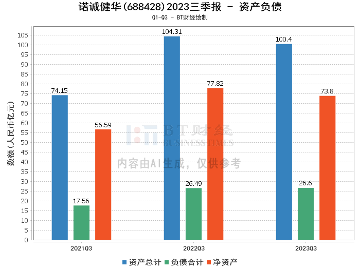 资产负债方面,诺诚健华截至2023年三季度末的总资产为100.4亿元,相较于上年度末的103.29亿元有所减少。负债总额略有下降,从上年度末的26.84亿元减至26.6亿元。净资产也从76.44亿元减少至73.8亿元,资产负债率小幅上升至26.49%,反映出公司财务结构的稳健。