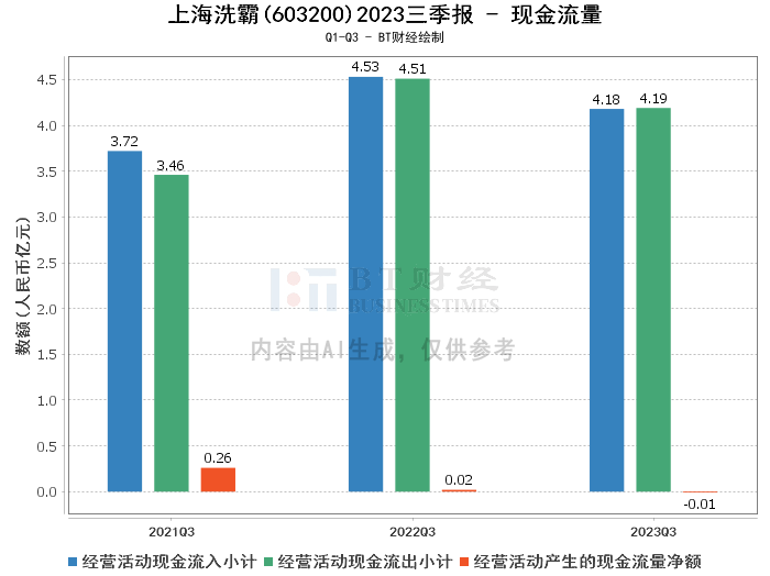 现金流量方面,上海洗霸在年初至报告期末的经营活动产生的现金流量净额为-148.83万元,较上年同期的244.09万元出现了下滑,主要是由于销售收款减少所致。经营活动现金流入小计为4.18亿元,而现金流出小计为4.19亿元,现金流入与流出相差不大,但较去年同期均有所减少。