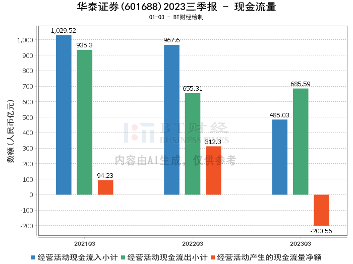 综上所述,华泰证券在2023年三季度整体经营状况良好,资产总额和净资产均实现了增长,盈利能力有所提升。然而,现金流量净额的下降可能需要公司进一步关注和优化经营活动的现金流管理。