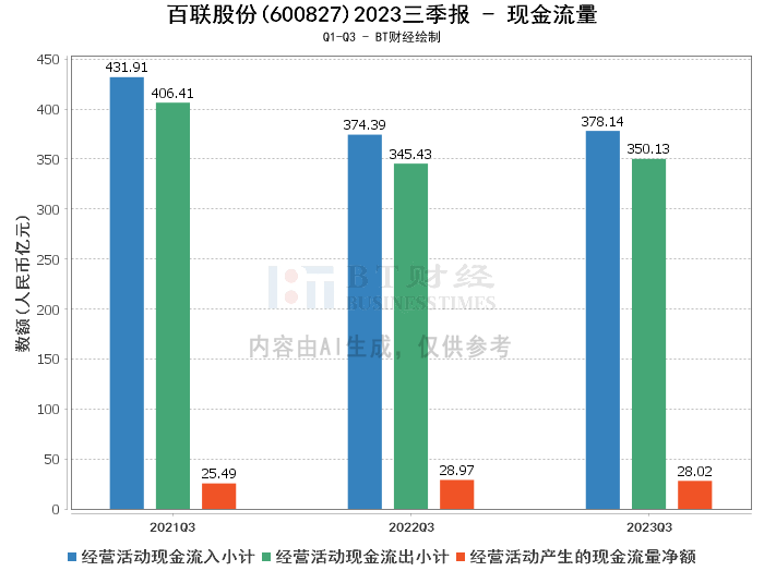 现金流量方面,百联股份在经营活动产生的现金流量净额方面表现稳健,尽管略有减少,从上年同期的28.97亿元降至28.02亿元,但仍保持在较高水平。经营活动产生的现金流入小计为378.14亿元,较上年同期略有增加,而现金流出小计为350.13亿元,也显示出相对稳定的趋势。