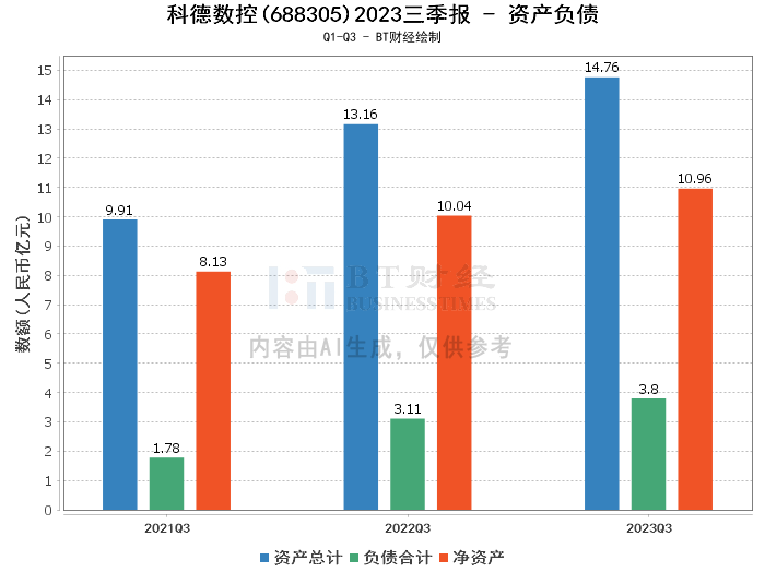 在资产负债方面,科德数控2023年三季报显示,公司总资产达到了14.76亿元,相比上年度末的13.36亿元增长了10.45%。负债合计为3.8亿元,较上年度末的3.05亿元增加了24.59%,净资产则从10.31亿元增至10.96亿元,增长了6.28%。资产负债率略有上升,从22.81%增至25.74%,反映出公司财务结构的轻微变化。