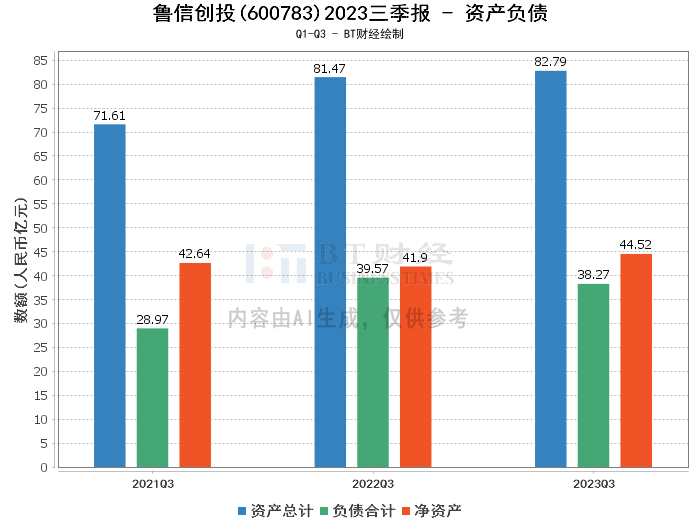 从资产负债方面来看,鲁信创投2023年三季报显示,截至报告期末,公司总资产为82.79亿元,相较于上年度末的85.09亿元,呈现了2.71%的减少。负债合计达到38.27亿元,较上年度末的39.25亿元略有下降。净资产则为44.52亿元,上年同期为45.85亿元。资产负债率略有上升,从上年度末的46.12%增至46.23%。