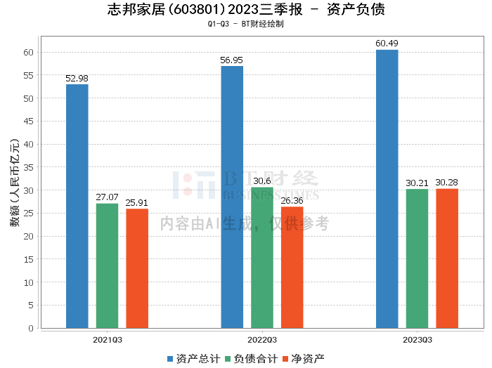 在资产负债方面,根据2023年三季报,志邦家居的总资产达到了60.49亿元,较上年度末的57.77亿元增长了4.70%。负债合计为30.21亿元,相比上年度末的28.99亿元增加了4.22%。净资产则从上年度末的28.79亿元增长到30.28亿元,增长率为5.18%。资产负债率略有下降,从上年度末的50.17%降至49.95%,显示出公司财务结构的稳健。