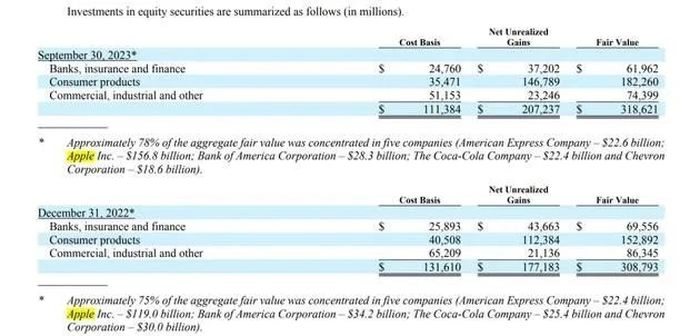 在前两季度分别盈利355亿美元和359.1亿元美元的情况下,伯克希尔·哈撒韦第三季度亏损125.7亿美元是重大投资的失败。财报显示,第三季度伯克希尔·哈撒韦出现了241亿美元的重大投资损失背后,主要是由于头号重仓股苹果三季度大幅下跌了11.6%。另外一个造成伯克希尔·哈撒韦亏损的原因是美债收益率飙升。