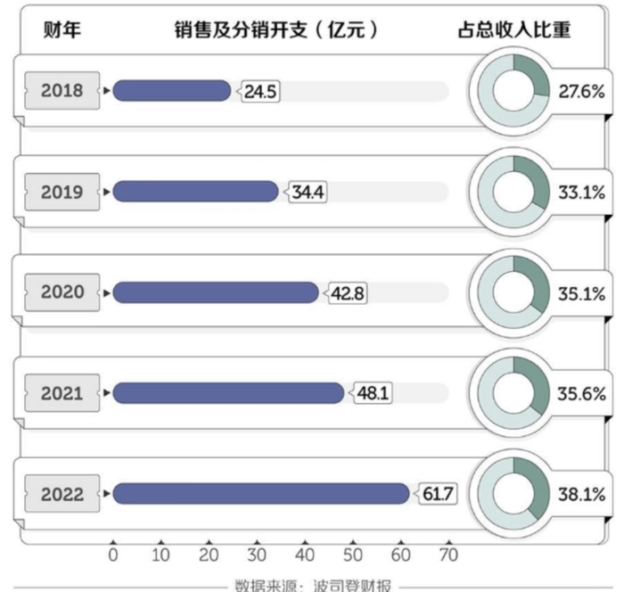 还需要注意的是波司登的营销费用激增。2018-2022财年,波司登销售分销开支上涨了1.5倍,占营收比例从27.6%上升到38.1%,接近四成,且每年营销占比均呈现出递增趋势。