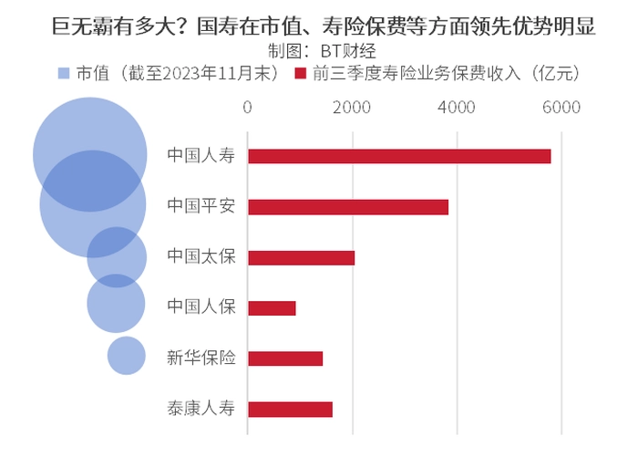 最直观的指标是市值。放在行业里面比较,目前A股前五大上市险企中,国寿市值近9000亿元,与中国平安( 601318.SH )同处在第一梯队,远高于第二梯队中国太保、中国人保2300亿元上下的市值。