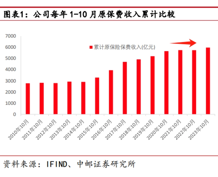 寿险保费收入上,国寿的领先优势更加稳固。2023年前十月,公司寿险保费收入近6000亿元,超出第二名2000亿元。