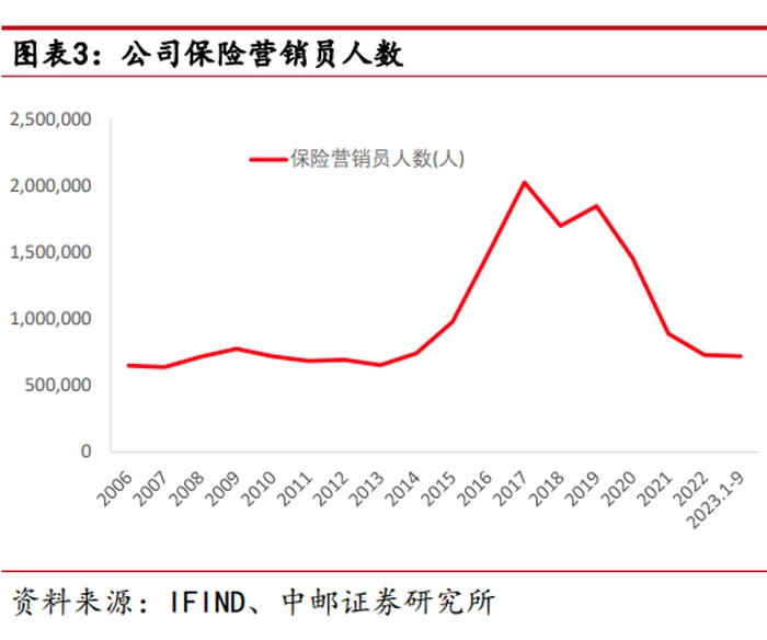 截至2023年三季度末,国寿营销人员为72万人,与年初相比下降9000人。中邮证券的一份研报认为,与此前三年年均减员几十万人相比,目前国寿的营销代理人改革已经步入尾声,人员规模企稳。从下图数据曲线上,更可以看出近两年改革的大刀阔斧。但这样的改革能否释放出长久的业绩增长动能,答案仍待时间验证。