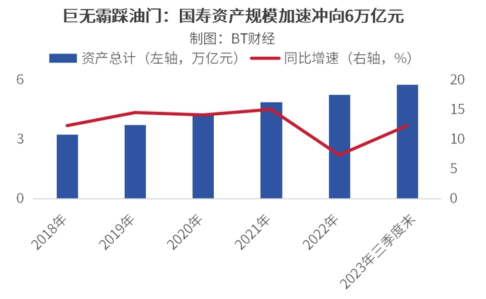 截至2023年三季度末,国寿总资产达5.76万亿元,投资资产也突破了5.5万亿元。与此同时,这家巨无霸公司还在踩油门。BT财经数据通综合过去5年数据发现,国寿总资产增速仅在2022年有所放缓,2023年前三季度重回12%以上的高增速,加速迈向6万亿元大关。