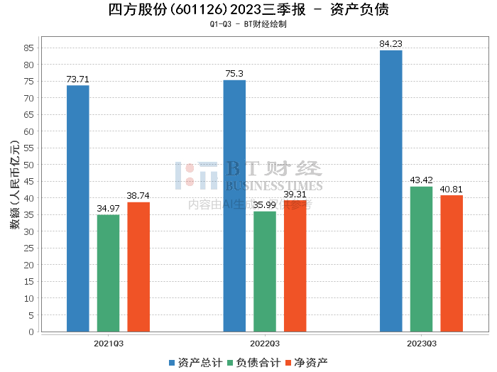 在资产负债方面,四方股份2023年三季度末的总资产为84.23亿元,与上年度末的84.52亿元相比微降0.34%。负债合计降至43.42亿元,较上年度末的44.04亿元下降1.41%,显示出公司财务结构的稳健。净资产则从上年度末的40.48亿元增长至40.81亿元,资产负债率从52.1%降至51.55%,表明公司在保持财务稳定的同时,也在逐步增强自身的资本实力。