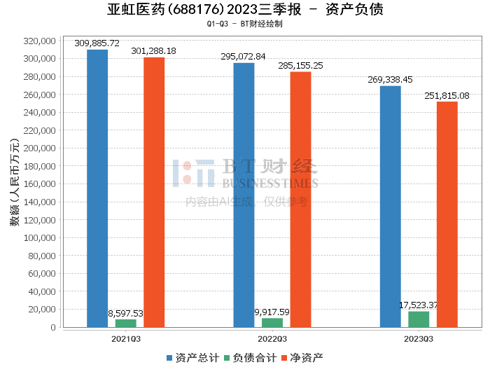 在资产负债方面,亚虹医药截至2023年三季度末的总资产为26.93亿元,相较于上年度末的28.74亿元有所减少。负债合计达到1.75亿元,较上年度末的1.03亿元增加,净资产则为25.18亿元,相比上年度末的27.71亿元有所下降。资产负债率从上年度末的3.58%上升至6.51%,反映出公司财务杠杆有所上升。