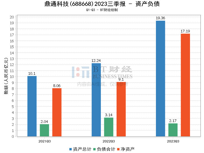 从资产负债的角度来看,鼎通科技2023年三季报显示,公司总资产为19.36亿元,相比上年度末的20.17亿元有所下降。负债合计为2.17亿元,较上年度末的2.86亿元减少,显示出公司在财务结构上的优化。净资产则略有下降,从17.31亿元减至17.19亿元。资产负债率从14.17%降至11.22%,这表明公司的财务杠杆有所降低,整体财务风险得到控制。