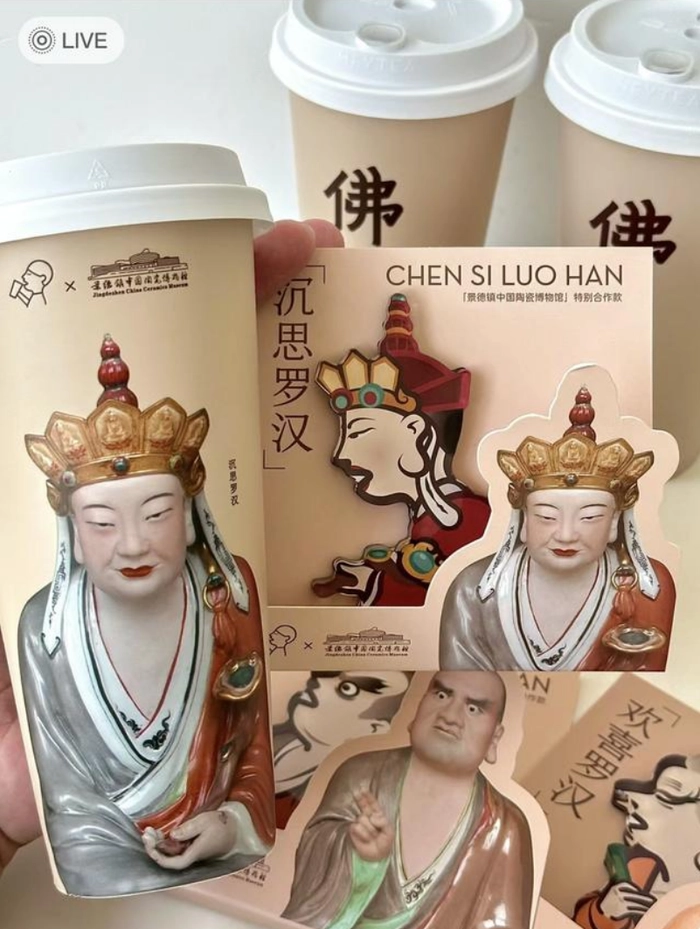此款产品为喜茶联名景德镇中国陶瓷博物馆推出,联名本是正常的商业行为,但喜茶选用的奶茶杯印有佛教工艺艺术作品,也就是备受网友关注的“沉思罗汉”,其独特的造型被网友调侃为“无语菩萨”和“我佛持杯”。