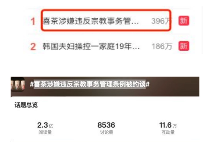 《21世纪经济报道》最新消息,因营销中涉及宗教事务,深圳宗教事务管理局于12月1日约谈喜茶公司,公司于12月3日将相关产品下架,同时就相关情况作出检查。连续几日,“喜茶涉嫌违反宗教事务管理条例被约谈”登上热搜,目前阅读量突破3亿。
