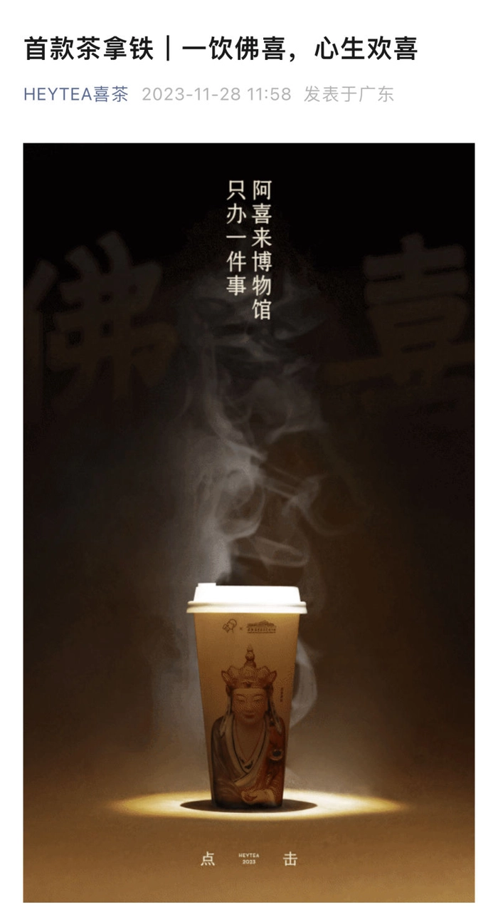 截至发稿前,喜茶虽然下架了全部的“佛喜”产品,官方微博也已搜索不到相关信息,但喜茶官方微信公众号“HEYTEA喜茶”依然未删除相关联名款的宣传信息。