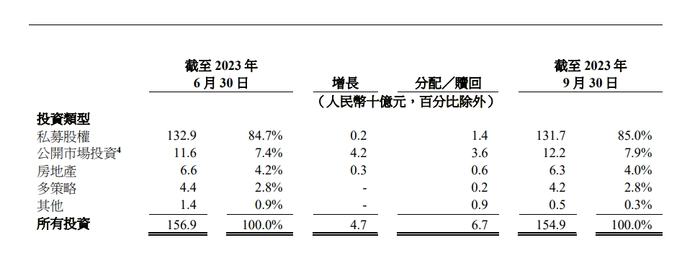 根据刚发布的财报,诺亚最新的总资产管理规模为1549亿元,同比、环比均下滑。其中85%、对应1317亿元投向私募股权,另有7.9%、4.0%、2.8%和0.3%的管理资产投向公开市场投资、房地产、多策略和其他。