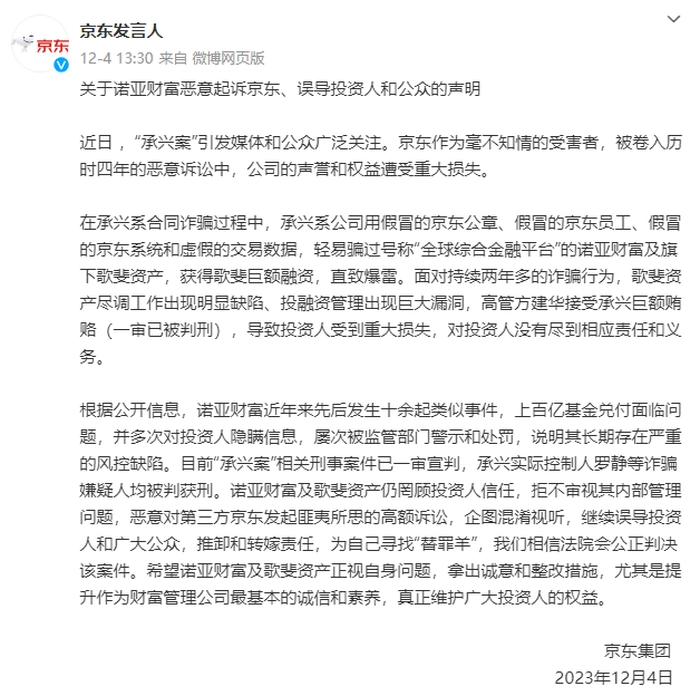 庭审在舆论受到关注后,12月初,京东火速在公开渠道发表声明,表示其自身也为案件受害者,被卷入历时4年的恶意诉讼中,公司的声誉和权益遭受重大损失。