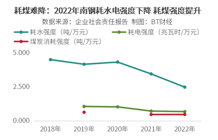 从能源、水资源消耗角度来看,据公司《2022年可持续发展报告》显示,近几年公司耗电总量、取水总量、耗煤总量逐年压降。综合营收的变化来看,BT财经数据通发现南钢的耗水强度压降幅度最快,耗电强度亦有较为明显的压降,但煤炭消耗强度在2022年出现小幅攀升,同花顺数据显示该指标从2021年的0.4696吨/万元小幅反弹至0.4714吨/万元。