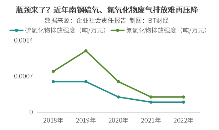 从排放处理角度来看,在经历了2018年到2021年的快速减排后,2022年南钢硫氧化物、氮氧化物等废气排放水平维持在较低水平,但继续压降的动能趋缓——硫氧和氮氧化物排放强度当年分别录得0.00017吨/万元和0.00030吨/万元,和2021年相比分别持平和下降0.00001吨/万元。