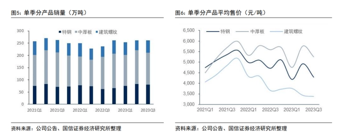 细分到产品上,南钢的中厚板和特钢有竞争优势,这些产品具有高附加值的亮点。2023年南钢的业绩也在向这些“更赚钱”的细分产品上倾斜,前三季度,特钢产品销量同比增长11.6%、中厚板销量同比增长10.4%,二者均明显高于建筑螺纹销量同比增长0.8%的增速。
