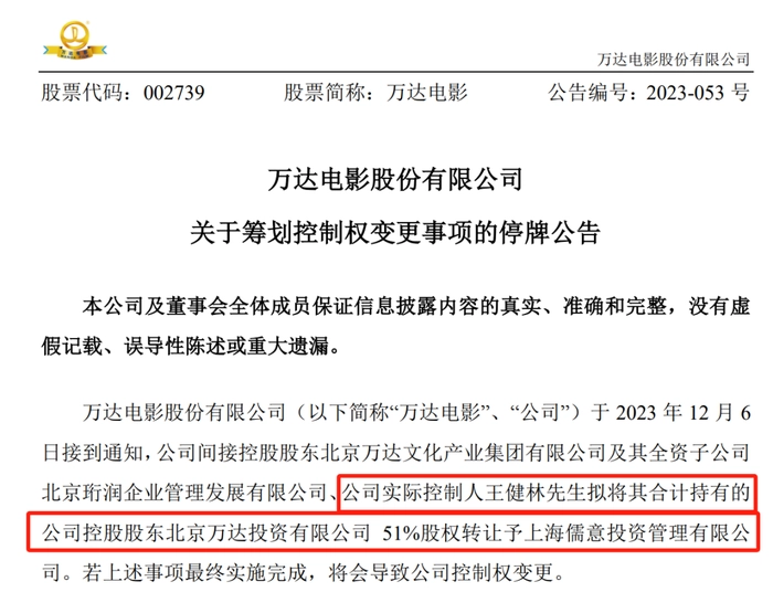 12月6日,万达电影(002739.SZ) 发布公告称,公司实际控制人王健林拟将其合计持有的公司控股股东北京万达投资有限公司51%股权转让予上海儒意投资管理有限公司。交易完成后王健林仅持有万达电影10%的股份,失去万达电影的控制权,上海儒意成为实控人。