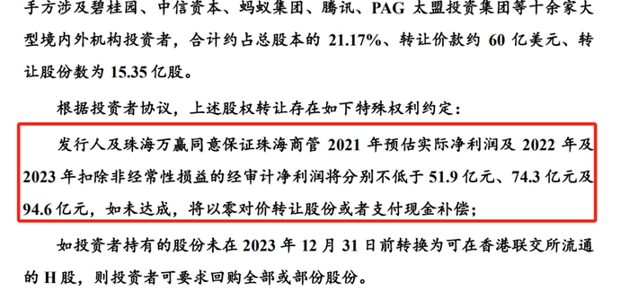 2022年12月,万达商管回复上交所的回函证实了万达商管和投资者之间确实存在“对赌协议”。回函表示“发行人及珠海万赢同意保证珠海商管2021年预估实际净利润及2022年及2023年扣除非经常性损益的经审计净利润将分别不低于 51.9亿元、74.3亿元及94.6亿元,如未达成,将以零对价转让股份或者支付现金补偿;如投资者持有的股份未在2023年12月31日前转换为可在香港联交所流通的H股,则投资者可要求回购全部或部份股份。”不仅对2021年至2023年万达商管每年的净利润金额提出要求,还明确了2023年12月31日前港股上市的要求。