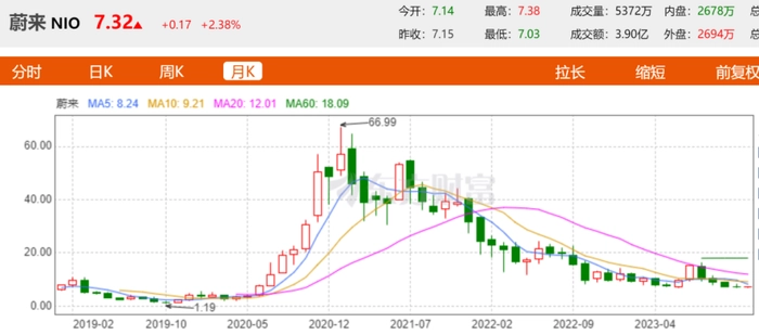 三季度的优异表现带动股价回升,截至12月5日收盘,蔚来股价为7.32美元,上涨2.38%,仅高于发行价6.26美元,相比高峰值时的66.99美元跌幅接近九成,市值跌去了1007亿美元,成为“蔚小理”三大造车新势力中市值最低的一家。