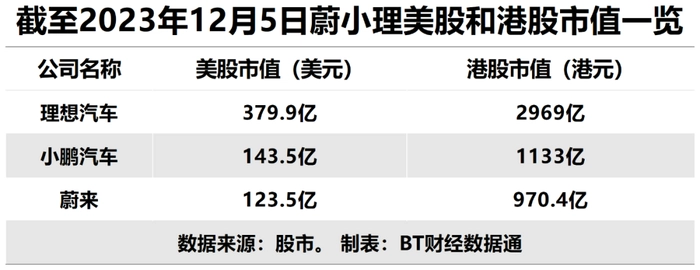 从2022年起理想的销量开始全面反超蔚来,同时在市值上也逐渐反超蔚来。截至12月5日,理想美股市值为379.9亿美元,港股市值为2969亿港元;同期蔚来美股市值为123.5亿美元,港股市值为970.4亿港元;小鹏同期美股市值为143.5亿美元,港股市值为1133亿港元,蔚来美股市值和港股市值均在“蔚小理”中垫底。其美股市值不足理想的三分之一,港股市值同样不足理想的三分之一。