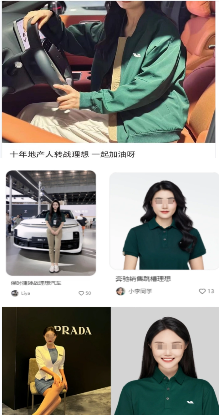 梳理《每日经济新闻》、中新经纬和上观新闻多方报道发现,理想的女性销售大部分是颜值颇高的美女,这也是理想最看重的一点,其中不乏由空姐转行、有地产销售转行,还有普拉达和LV的销售转行入职理想,甚至连vivo旗下子品牌IQOO的产品经理宋紫薇,理想也收入麾下。