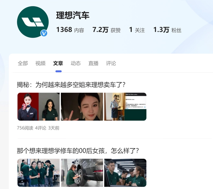 通过理想的官方百家号发现,理想近期明显偏向“美女”的宣传,近期的两篇文章分别是《揭秘:为何越来越多的空姐来理想卖车了》和《那个想来理想学修车的00后女孩怎么样了?》很难想象,销量在造车新势力一骑绝尘的理想,平时的宣传重点是这样的,引发媒体和行业的广泛关注。