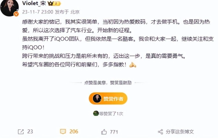 2023年9月14日,话题 #宋紫薇离职# 曾登上微博热搜。以此推算,宋紫薇已经入职理想差不多有3个月,在此之前,宋紫薇一直没有透露自己离开vivo后要去哪家车企,在11月7日的微博中,宋紫薇透露了下一站是车企,并希望汽车圈的同行和前辈能多指教,可见保密工作出色,12月10日,宋紫薇在理想的首秀成功出圈,让理想赚足了热度。