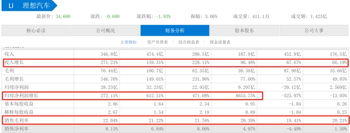 据多期财报显示,进入2023年以来,理想的营收和净利润均以3位数以上的增幅,这在众多车企中没有之一,其中营收增幅分别为228.11%、159.31%和271.21%,净利润增幅分别为471.08%、612.51%和272.11%。2022年第四季度,理想净利润增幅达到惊人的8655.75%,也正是在这一季度理想扭亏为盈。