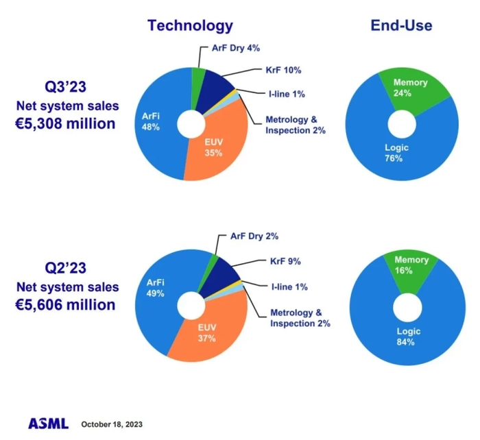 报告中指出,该公司在本期的销售业绩中,得益于两个主要的因素:一是本期销售的设备中,浸润式设备的比例较高;二是发生了一些非经常性的一次性费用。这两点共同推动了阿斯麦在本期的销售业绩。