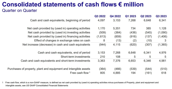 目前,对阿斯麦半导体制造设备的疲软需求环境意味着,不仅在2023年,而且到2024年该公司现金流的产生能力都很疲弱。因此,该公司在第三季度的回购总额仅为1亿欧元,与今年上半年回购的9亿欧元相比大幅下降。