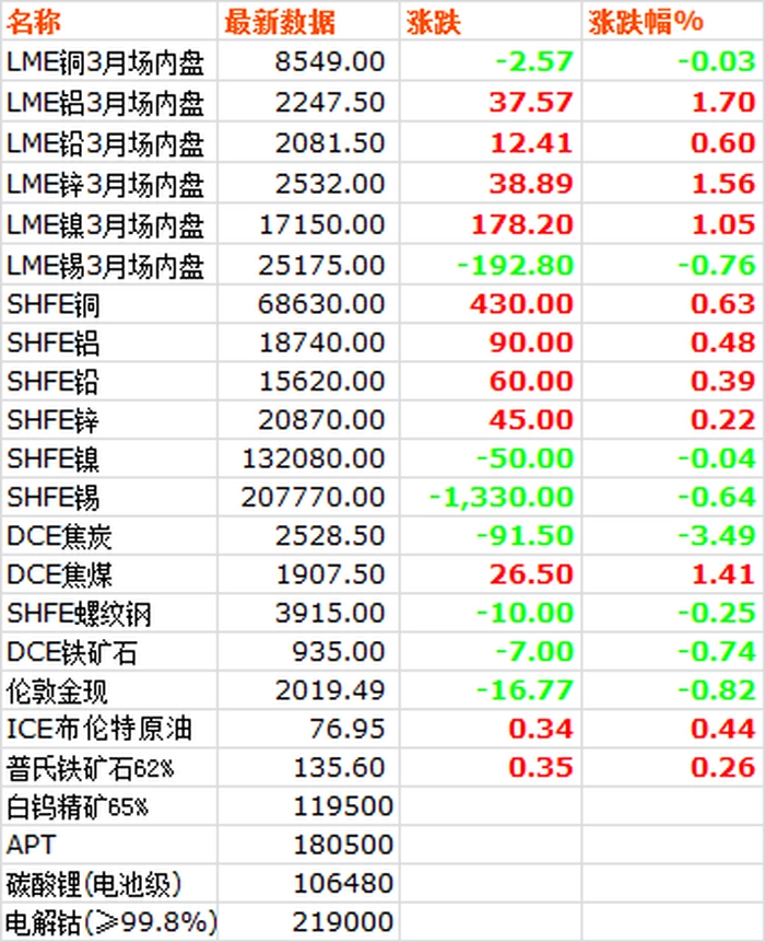 12月15日,LME六种基本金属价格涨多跌少,铝涨幅居前,铜锡小幅下跌。三月期铜价日内波动较大,冲高回落后小幅回升,收于8549美元/吨,下跌0.03%。三月期铝价收于2247.5美元/吨,上涨1.70%。三月期铅价冲高回落,收于2081.5美元/吨,上涨0.60%。三月期锌价日内整体上行,收于2532美元/吨,上涨1.56%。三月期锡价收于25175美元/吨,下跌0.76%。三月期镍价收于17150美元/吨,上涨1.05%。