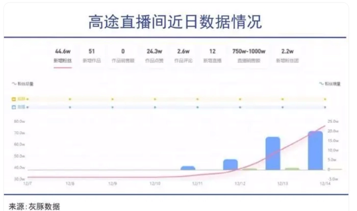 据《澎湃新闻》报道,受董宇辉“小作文”事件助推,高途佳品的粉丝数量激增。12月14日,高途直播间粉丝首次突破100万,GMV(商品交易总额)突破千万,甚至一度排在抖音带货总榜头名,日均带货销售额较前一个月的平均值翻了100倍。