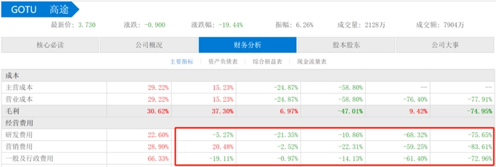 高途财报显示,研发费用由去年同期的1.233亿元降至0.97亿元,同比减少21.35%,营销费用和一般及行政费用则分别下滑了2.52%和0.97%。此前已经连续5个季度的研发费用和营销费用以及行政费用均出现大幅下滑的情况。“双减”前的季度,高途研发费用达4.3亿元,随后一路下滑至今年第一季度的不足1亿元。营销费用由2021年第一季度的22.89亿元,直接跌至今年一季度的2.84亿元,几乎是2021年的零头。行政费用由2021年第二季度高位的2.42亿元,降至今年一季度的0.79亿元。