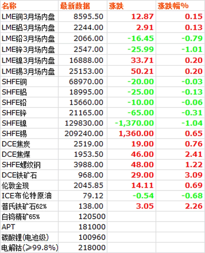 12月21日,LME六种基本金属价格涨跌互现,锌跌幅较大。三月期铜价收于8595.5美元/吨,上涨0.15%。三月期铝价收于2244美元/吨,上涨0.13%。三月期铅价震荡回落,收于2066美元/吨,下跌0.79%。三月期锌价收于2547美元/吨,下跌1.01%。三月期锡价收于25153美元/吨,下跌0.20%。三月期镍价收于16888美元/吨,上涨0.20%。