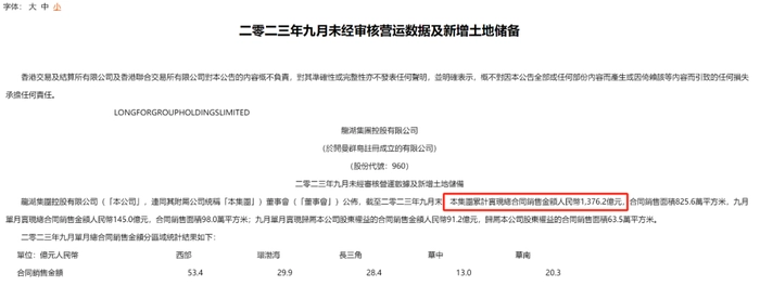 据龙湖集团公告显示,在前三季度合同销售金额达到1376.2亿元。但在公告中并未对三季度业绩进行更多披露。在已经发布的半年报中,龙湖集团在今年上半年实现营收620.4亿元,同比出现34.56%的下滑。但归母净利润为80.58亿元,同比增长7.73%。