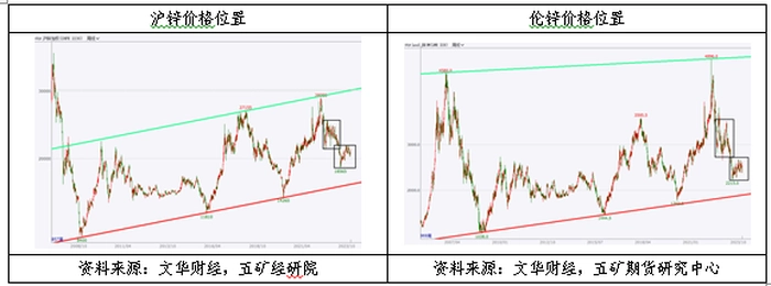 四、沪锌和伦锌分别处在长期价格区间中部偏低位置和低位