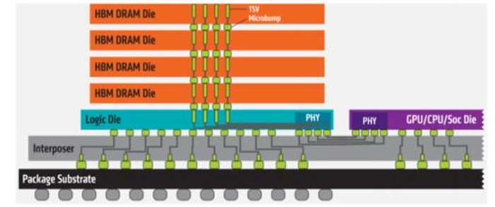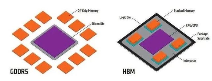所谓HBM,即高带宽存储器的简称,其本质上是一种图形DDR内存,但拥有独特的封装技术。这种技术可以垂直堆叠多个DRAM芯片,通过中介层与GPU紧密连接。