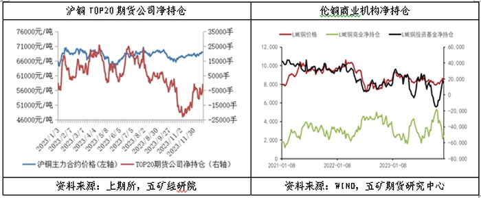 12月22日,沪铜持仓量TOP20期货公司持有净空头890手,显著收缩空头敞口。12月15日,伦铜商业机构(包括生产商、贸易商、加工商、用户等产业客户)持有净空头54688手,较上月同期空头敞口扩大17789手,投资基金转为持有净多头敞口18146手,较上期多头敞口扩大15614手。