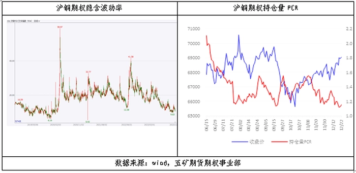 12月22日,看跌持仓量55487张,较上月同期减少2190张;看涨持仓量48302张,较上月同期上升5460张;持仓量PCR收于1.15,虽较上月同期下降0.20,但仍位于1.00多空情绪临界值以上,反映市场情绪偏多。从12月变化来看,卖出看涨期权持仓量同比增加,导致持仓量PCR数值较上月同期有所回落,表明沪铜价格上涨至震荡区间上沿附近,短期看跌情绪正在不断增强。