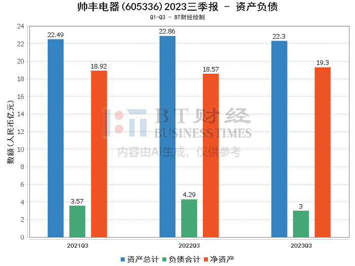 从资产负债方面来看,帅丰电器2023年三季报显示,公司总资产为22.3亿元,相较上年度末的22.8亿元略有下降,负债合计为3亿元,较上年度末的3.59亿元有所减少,净资产则小幅上升至19.3亿元。资产负债率从15.73%降至13.43%,显示公司的财务结构更为稳健。