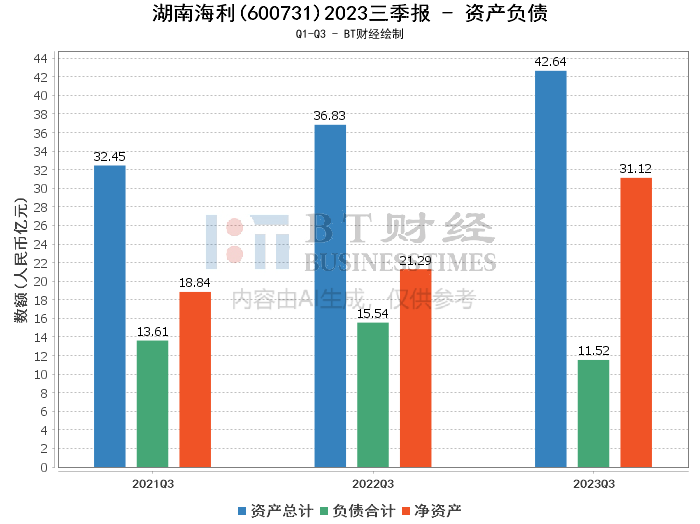 在资产负债方面,根据2023年三季报显示,湖南海利的总资产达到了42.64亿元,相较于上年度末的39.25亿元有所增长。负债合计降至11.52亿元,较上年度末的17.32亿元显著下降。净资产则从上年度末的21.93亿元增加至31.12亿元。资产负债率由上年度末的44.12%下降至27.01%,显示出公司的财务结构得到了优化。